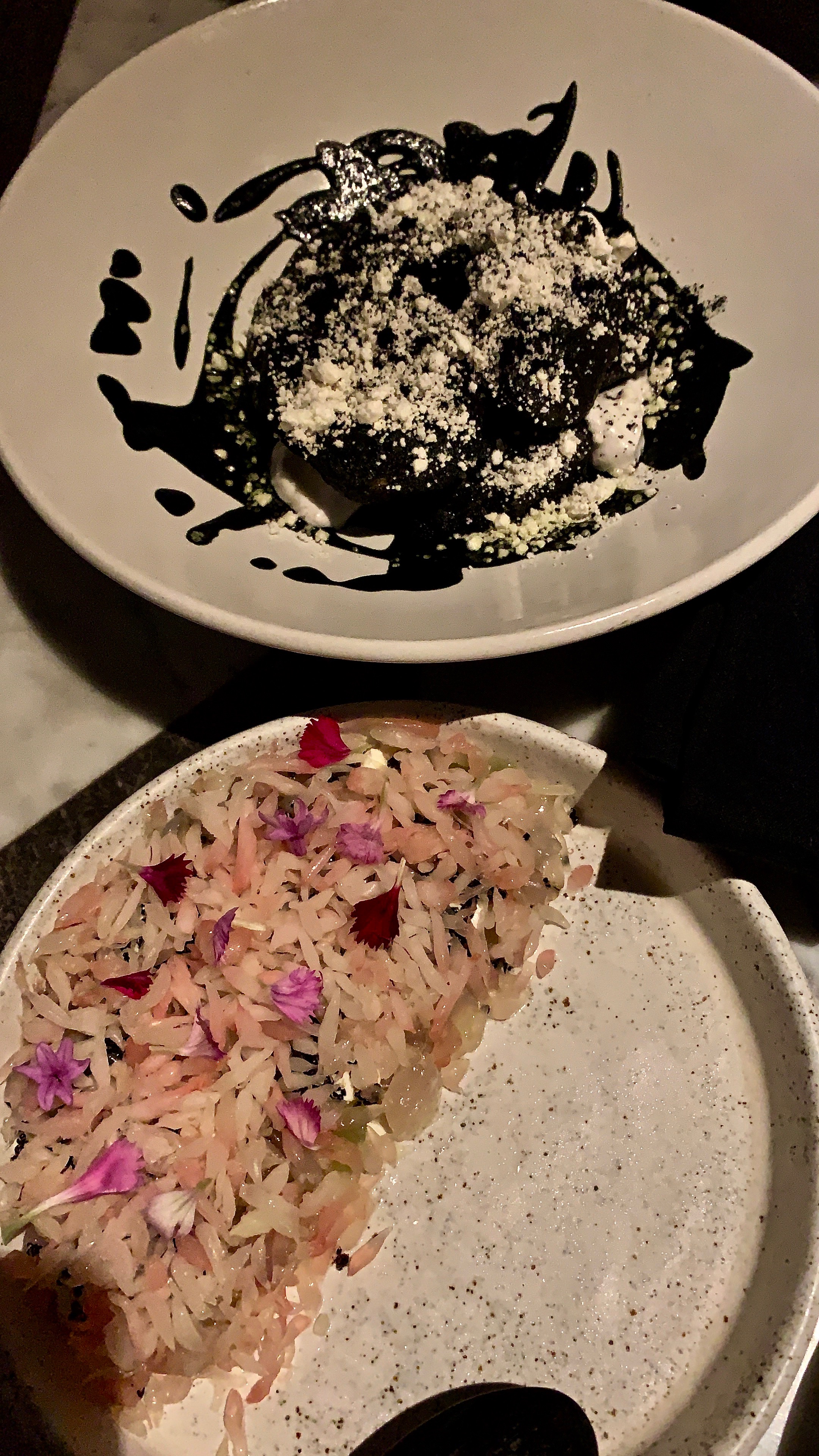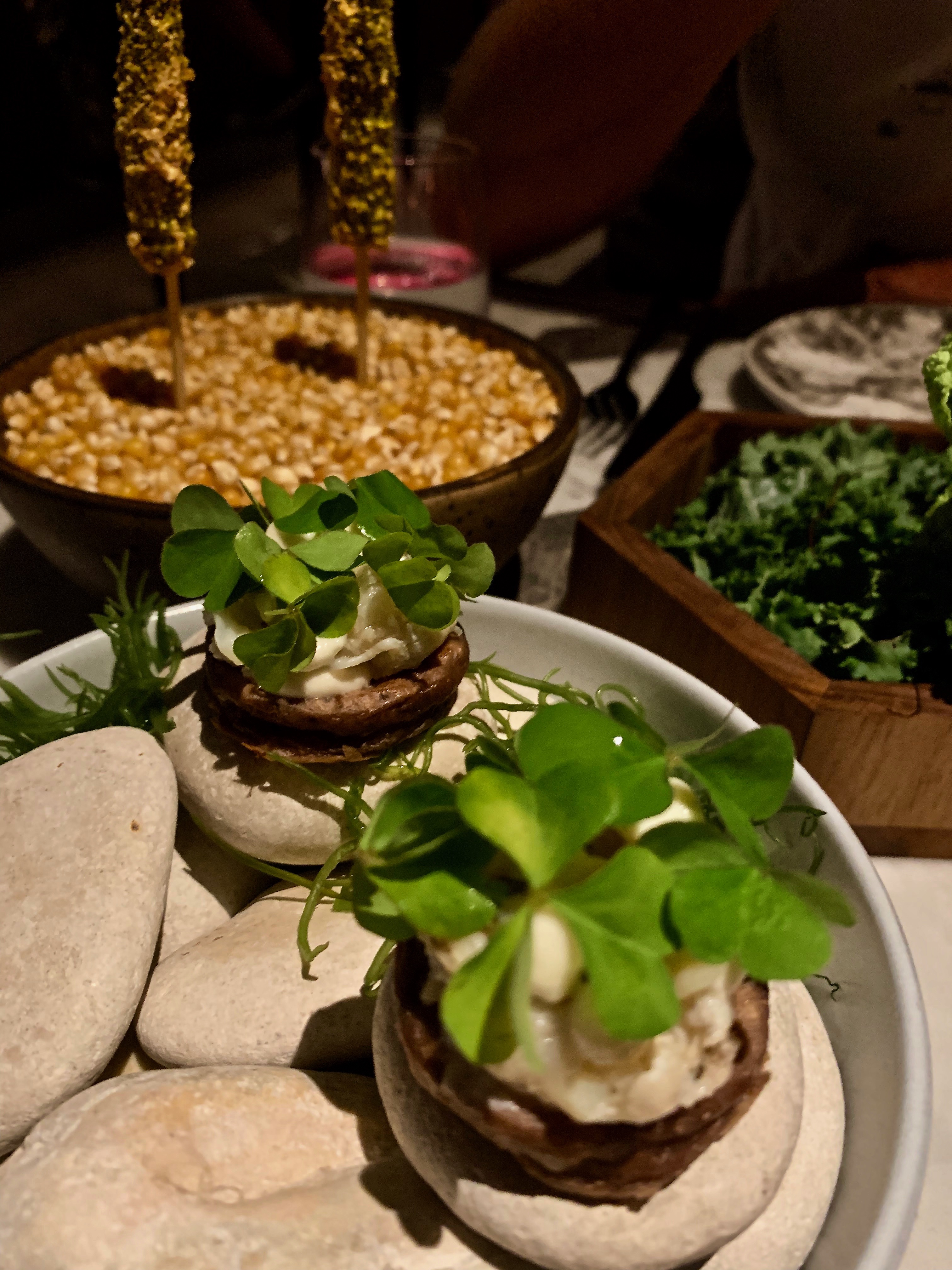 We had a cocktail each mine was a bloodless Bloody Mary so the tomato juice had been clarified with drip each of chilli oil and basil oil floating on the surface . Tony had a Bloody Mary he said its was the best he had ever had. Even the head cocktail maker come over and explained the process of how our drinks are made. Love the detail of that. Lets get down to the serious business of eating. We chose the feed me option of vegetable dishes and fish. So not long after our waiter Wayan introduced himself that snacks had arrived at the table. Kimchi crisp. chargrilled baby corn, potato croquette. beautifully presented. That got the taste buds alive. Next crisp eggplant with a yellow curry the dish was all black. But the taste was unbelievable, ceviche of snapper, stracciatella cheese with smoked tomatoes,roasted carrots with smoked yogurt and quinoa, Barramundi, clams and and an oyster cracker. Desert was strawberry compote with liquorice ice cream. OMG I am not that big on deserts but that was amazeballs. The whole night was wonderful to talking to front of house a french lady to talking to all the staff, so beautiful. A lasting memory.