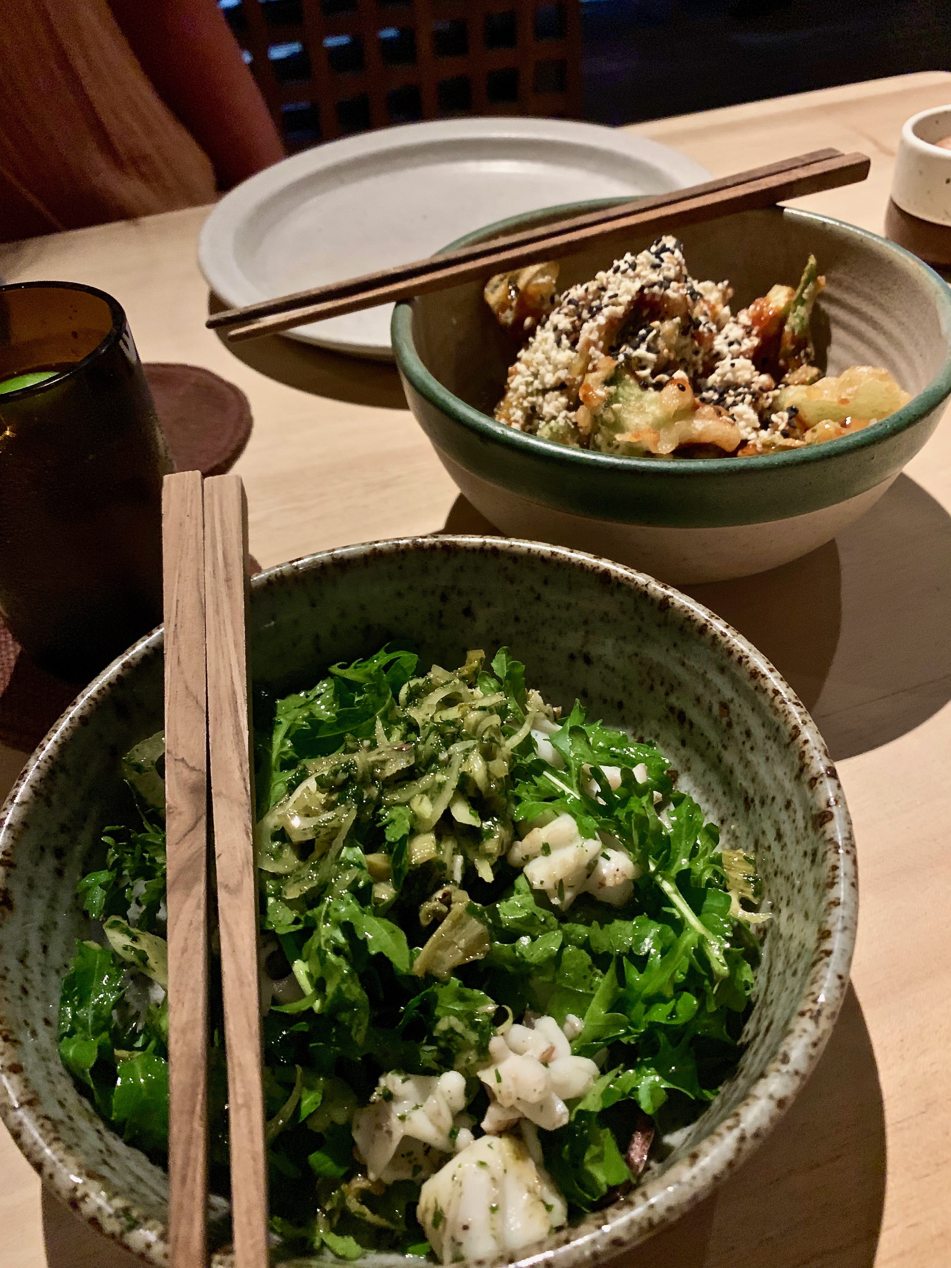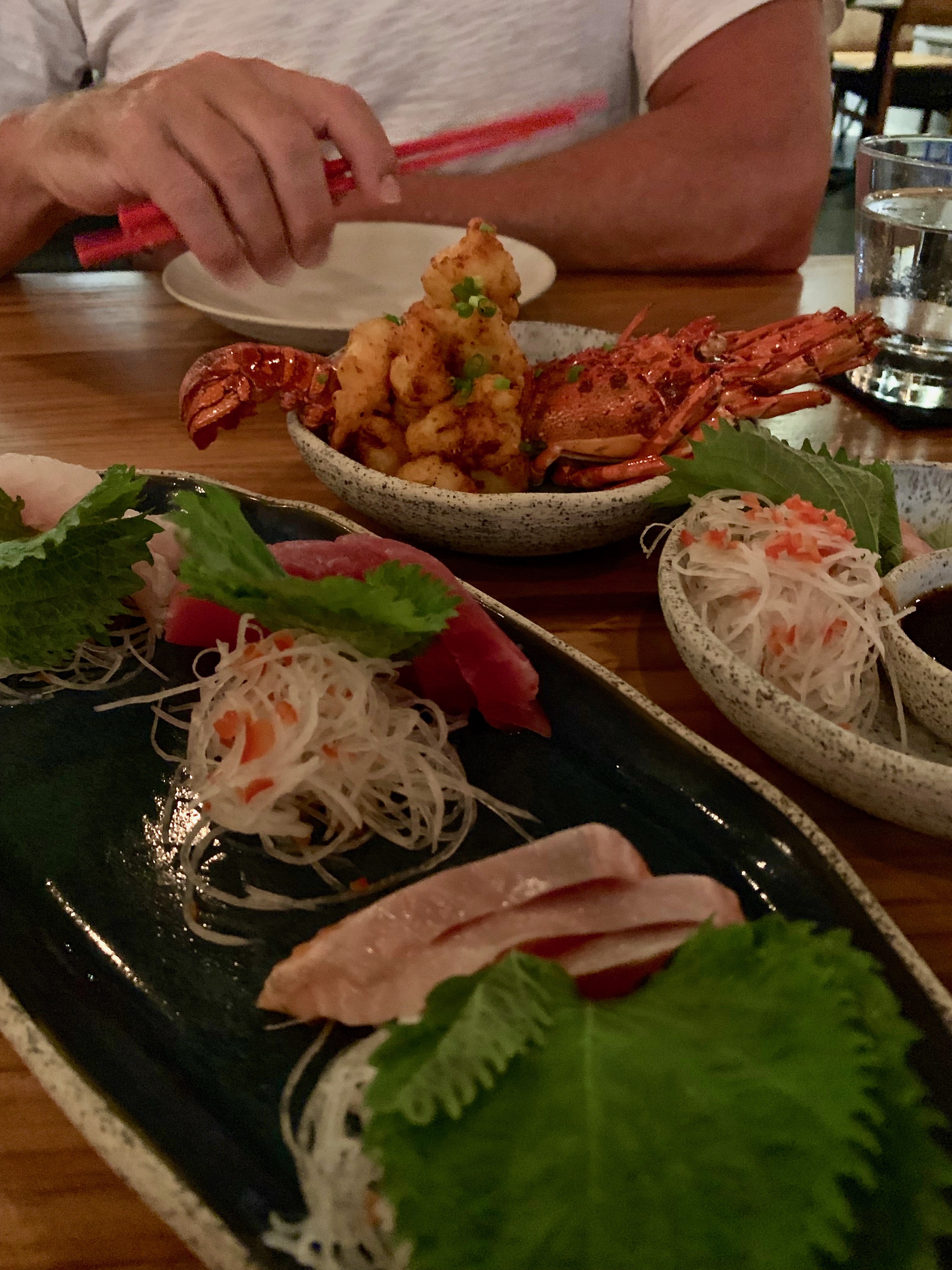 Tonight we went to Billy Ho the new kid on the block right next door to The Slow. We have been watching Billy ho come alive with the beautiful blessing of the restaurant and the tempting staff telling us come back soon. We did have chat with the beautiful and engaging Sharon front of house. What a lovely human being she is, not because of her fabulous name. She was just so welcoming after our chat a few days before apologising that weren’t open and please come back in a few days and of course we did. We weren’t disappointed either. To the very tasty cocktail of coconut mojito and Tony had an amazing bourbon whiskey appretive kind of cocktail. Many thanks to Sharon as they were on the house cause we came back. See put my hand in the fire again did I burn it? The jury is out on that one. It was yum, the food, Japanese infusion we had a sashimi plate, tempura lobster, tempura oyster, octopus skewers like a yakitori and salt and pepper grouper with a salted egg. So full…… The staff were so eager to please especially our waiter Wayan and Sharon was so lovely had some funny stories to tell us from managing hotels and restaurants around Asia. We are going back tomorrow night for our last dinner in Bali as there is more to try on menu.