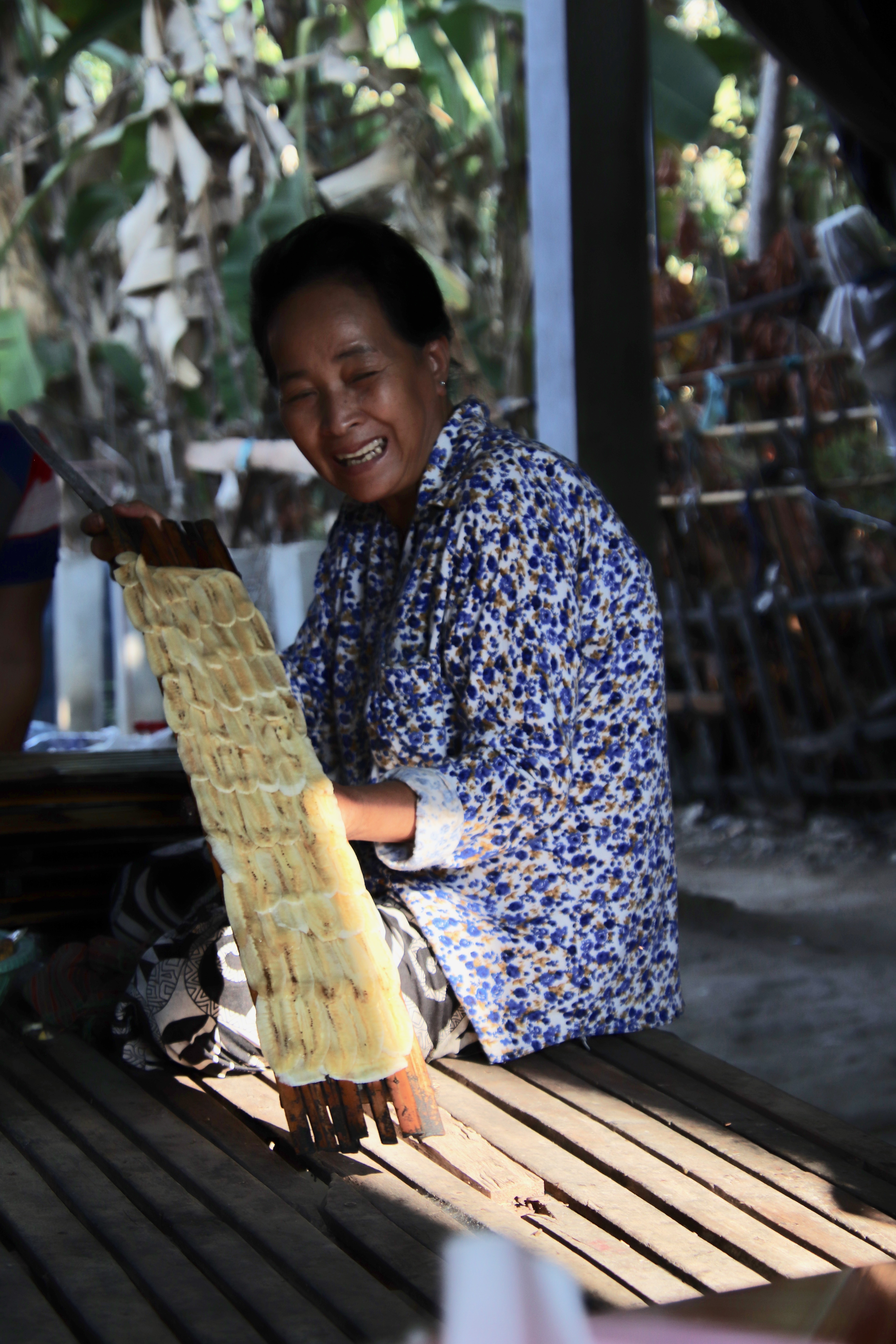 Next day we are taken by a local guide around to view the local industries in food. First stop was a lady who made dried banana from a special little lady finger variety. It was really tasty. She was telling a story that when the Khmer Rouge were in power you had to hide and eat as the food by order That all food was given to the soldiers if not, you where shot. So a lot of sneaking around to feed the children and themselves how horrible that sounds. I guess this is how the the locals started eating bugs and rats for protein. We also tried some rice wine more like grappa had a punch to it and some sticky rice cooked inside bamboo. Mr Lot loved it…..pass for me.