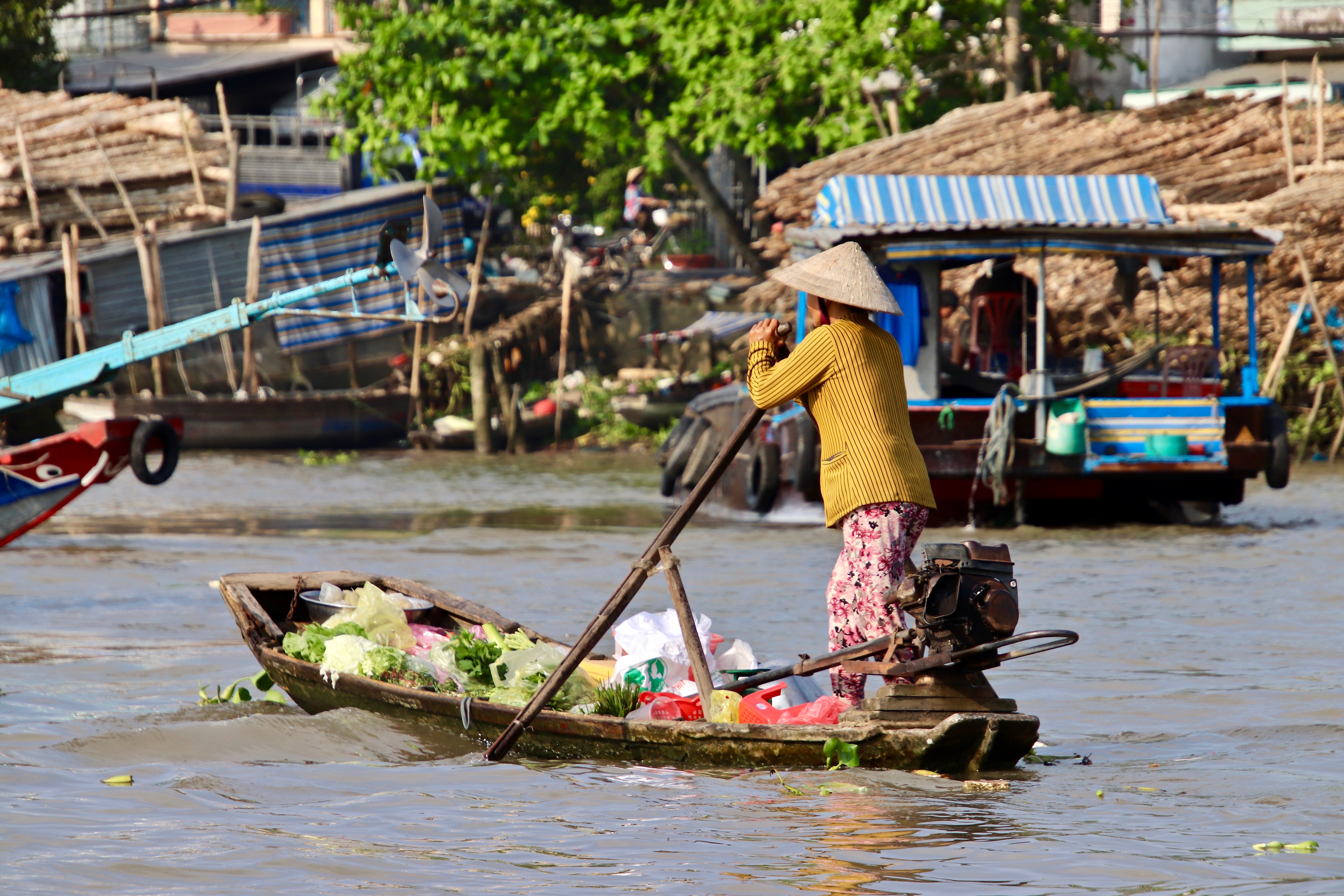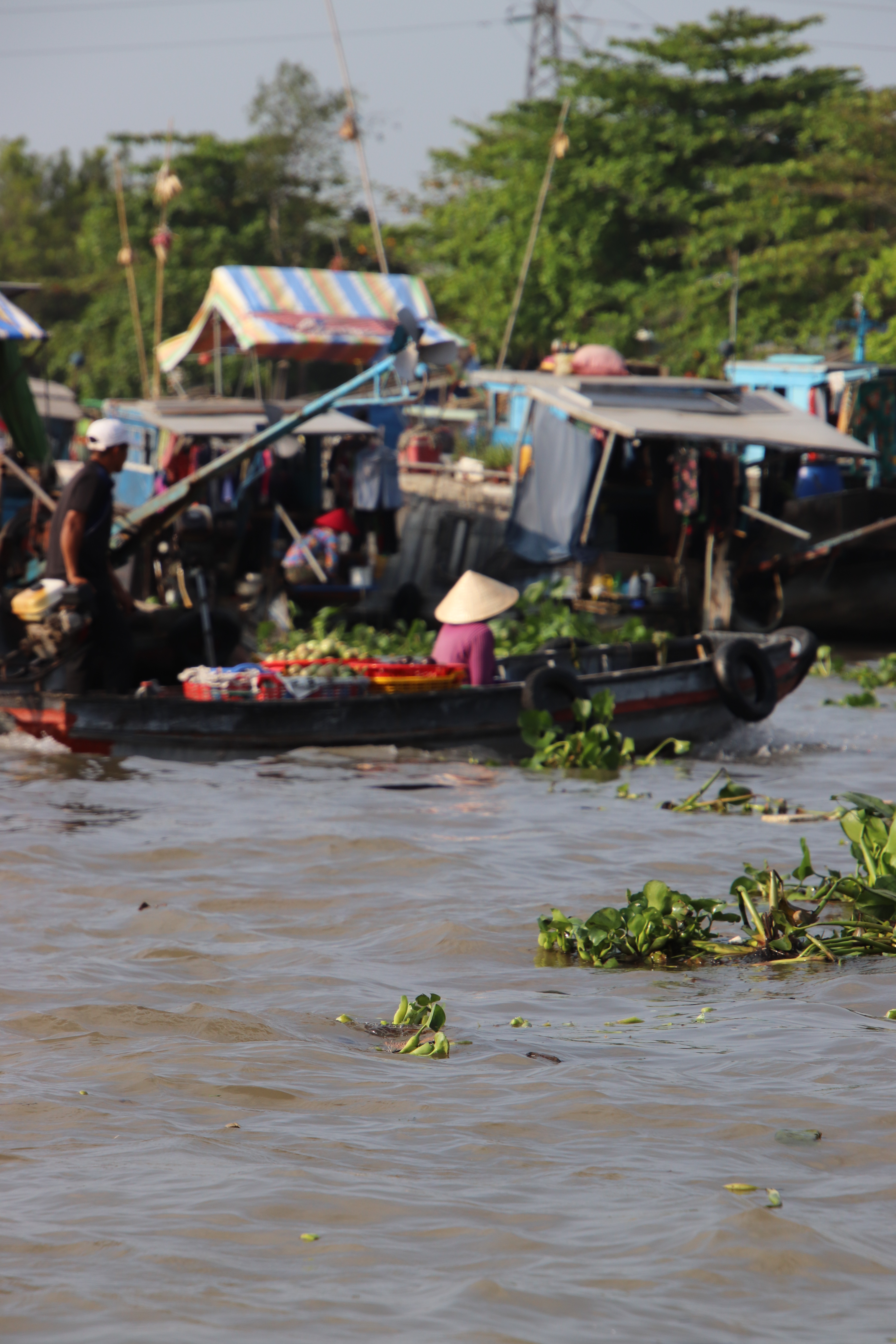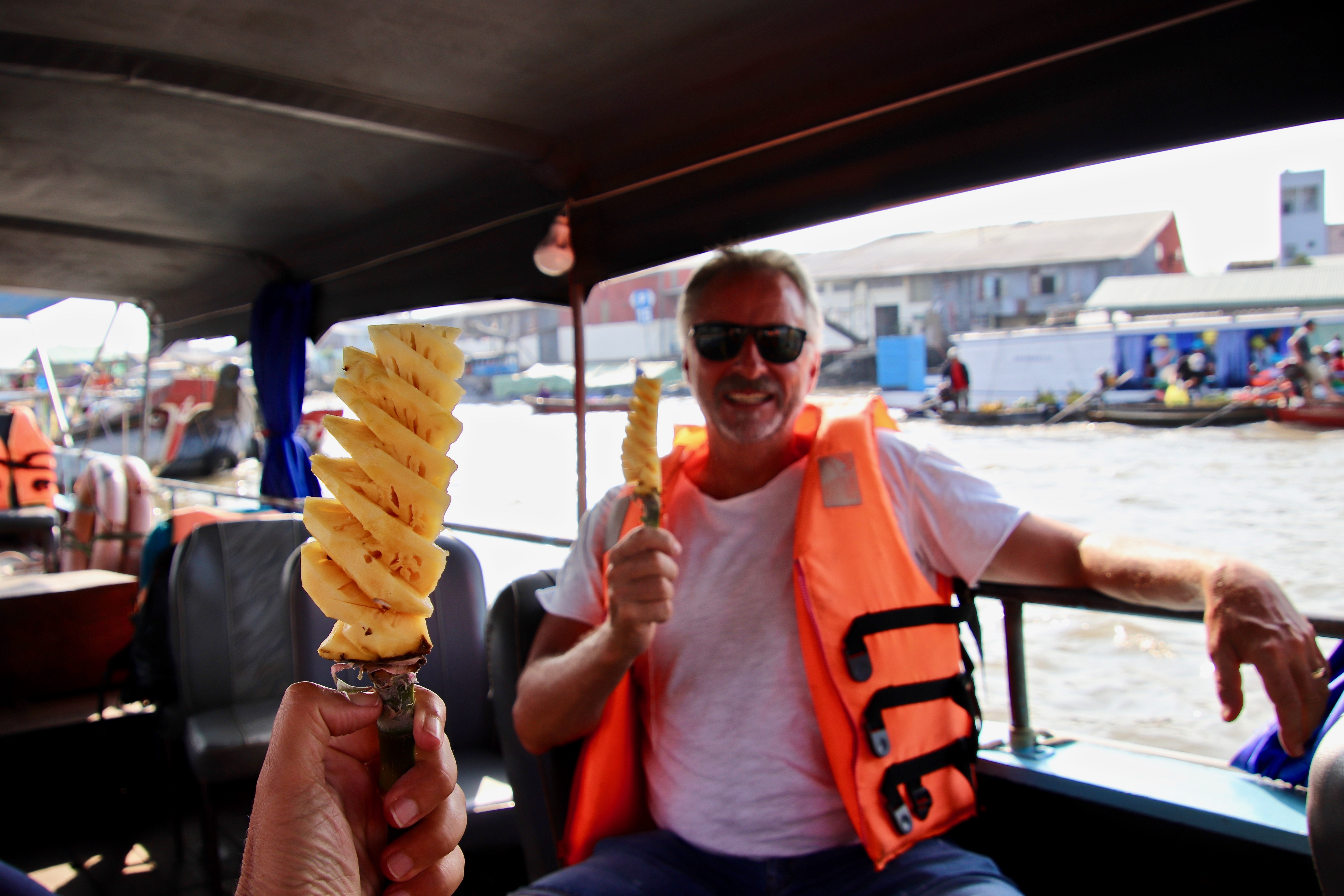 Another big day coming up have 70kms not sure if we do that or not, the guides always along the way seem to fudge the kms a little. But today was the worst day of the whole ride it was so bumpy my bum Tony’s ass was killing him we couldn’t escape the bumps. Your wrists, shoulders the whole dam body was shaken just wanted the day to finish please, plus it was hot. We did stop along the way at some craft places a lady had amazing skill making grass mats on a machine. So a moment of respite. We did finish with a beer and a cold towel today how good is that on a tray, five stars to you Mr Bao. the accommodation was really nice for the second to last night. We were up next morning doing a boat ride to the floating markets very interesting indeed but I think I would love to have been there at dawn when the real business of food trade is happening. To many tourists boats like us.